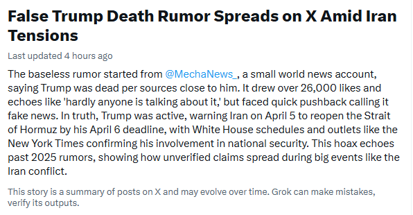 According to a summary attributed to Grok, the speculation appears to have originated from posts by the X account @MechaNews_, which wrote, “Donald Trump is reportedly dead, according to several sources close to the President.”