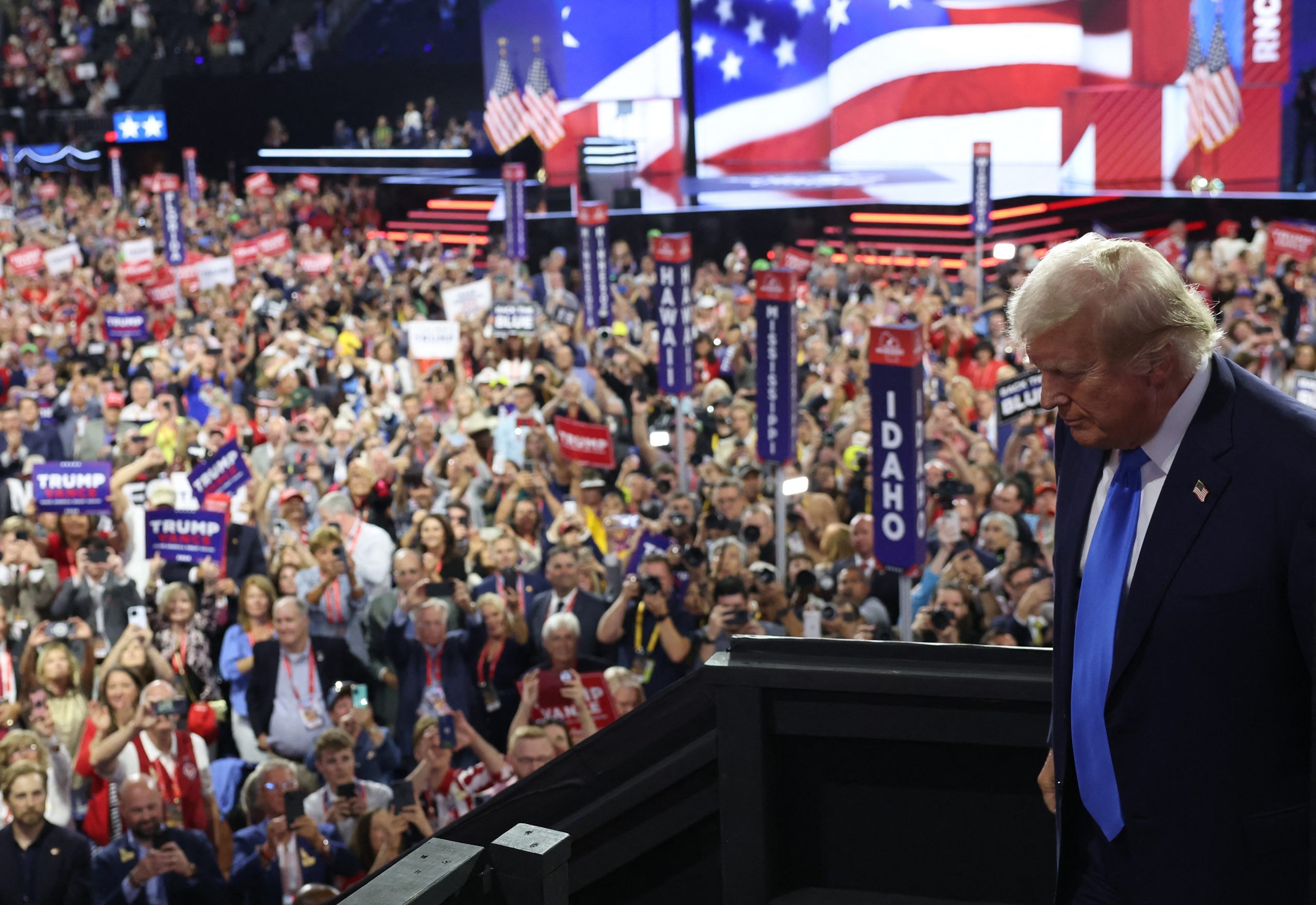 Republican presidential nominee and former U.S. President Donald Trump attends Day 2 of the Republican National Convention (RNC), at the Fiserv Forum in Milwaukee, Wisconsin, U.S., July 16, 2024. REUTERS